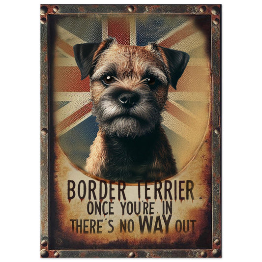An Aluminum Print Looking Like A Rusty Sign With A Border Terrier And A Mob Text.