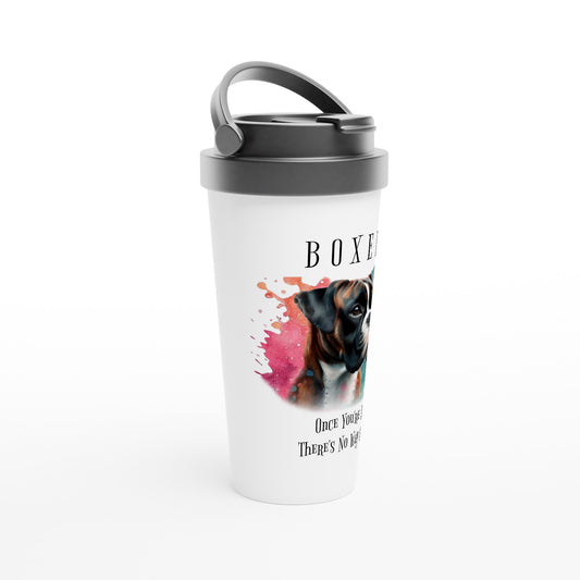 Brindle Boxer In Watercolors With A Text - Never Just A Dog. White 15oz Stainless Steel Travel Mug