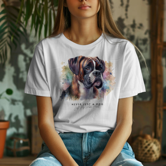 Brindle Boxer In Watercolors With A Text - Never Just A Dog. Just My Whole Heart. Premium Womens Crewneck T-shirt | Bella + Canvas 6004