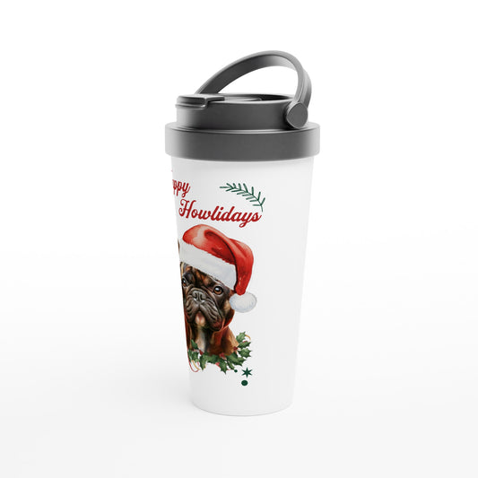 Christmas Brindle Frenchie Mug – Happy Howlidays Design – White 15oz Stainless Steel Travel Mug.