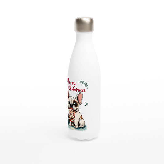 Humourus Christmas Honey Pied French Bulldog Puppy Water Bottle – White 17oz Stainless Steel Water Bottle