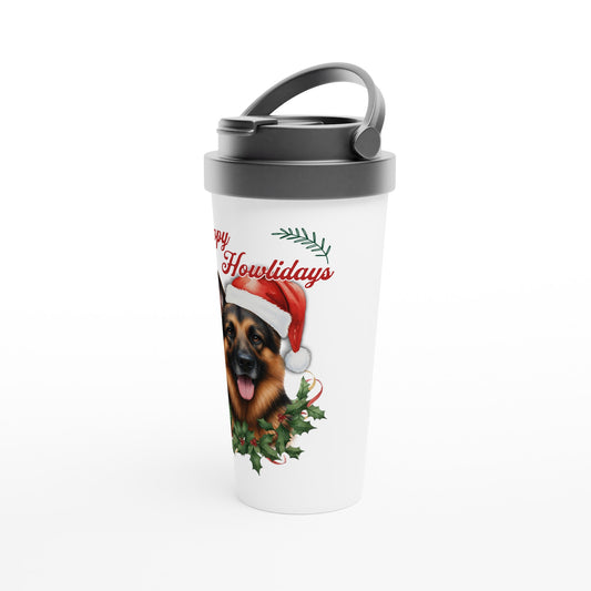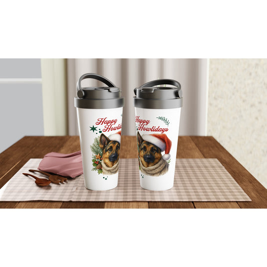 Christmas German Shepherd Travel Mug/Tumbler – Happy Howlidays Design – White 15oz Stainless Steel Travel Mug